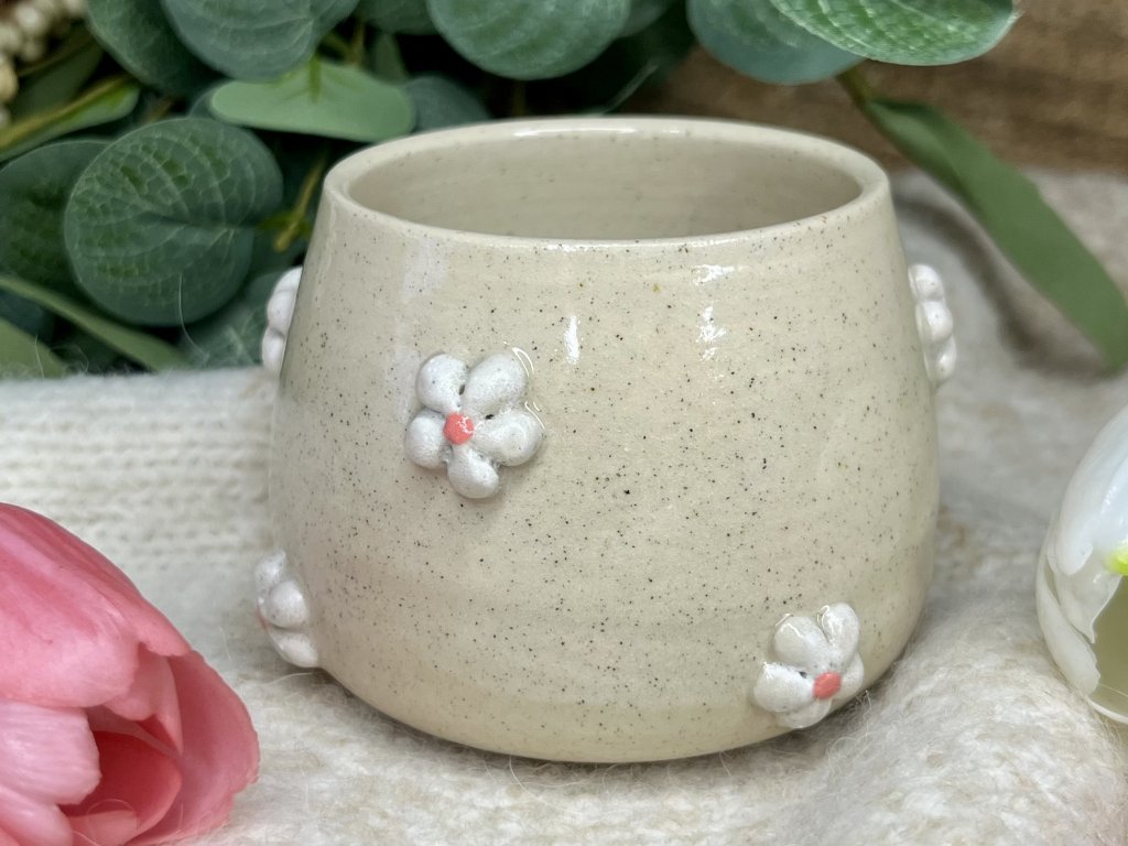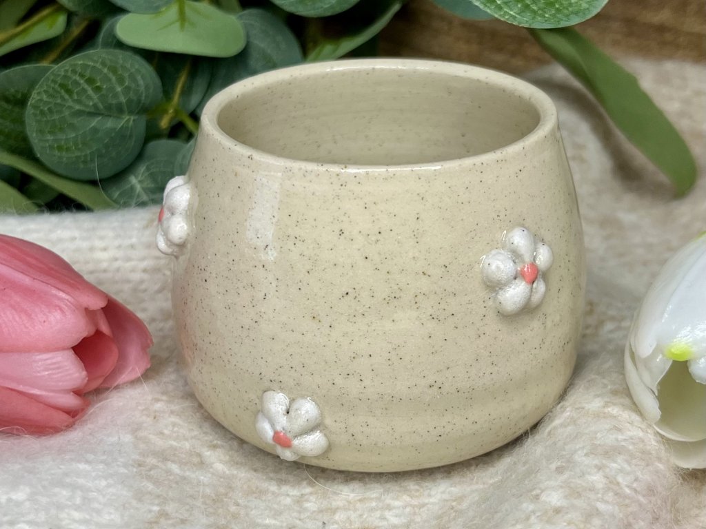 Kalíšek o objemu cca 210 ml, ručně točený ze světlé pigmentové hlíny, glazovaný transparentní glazurou.