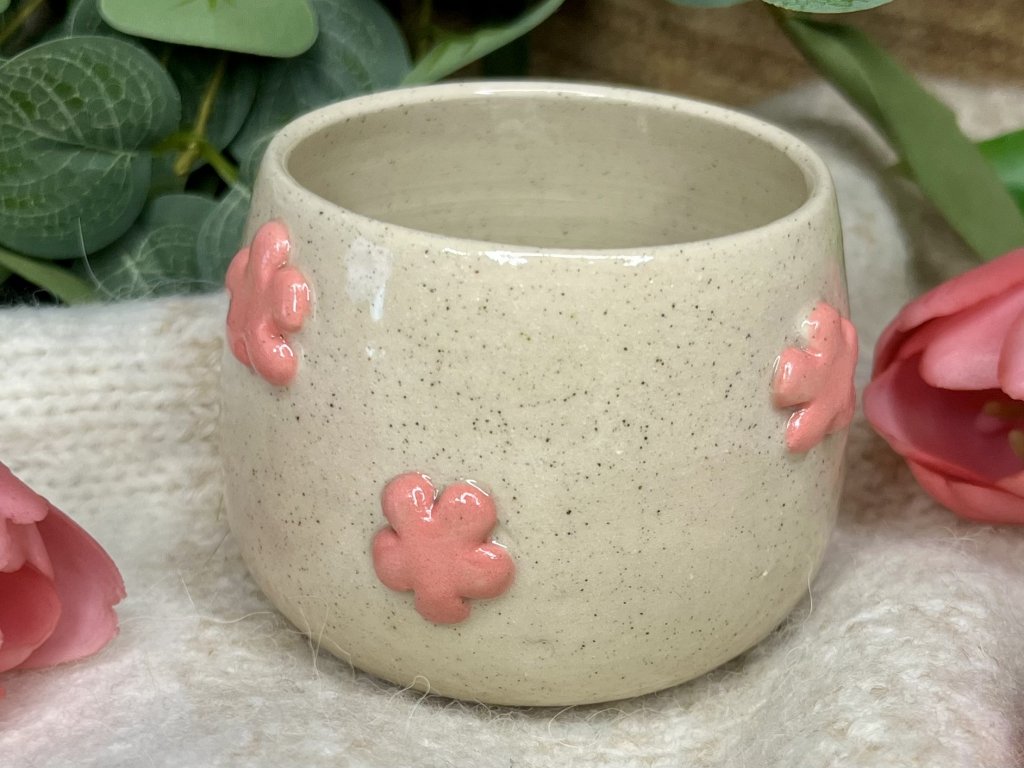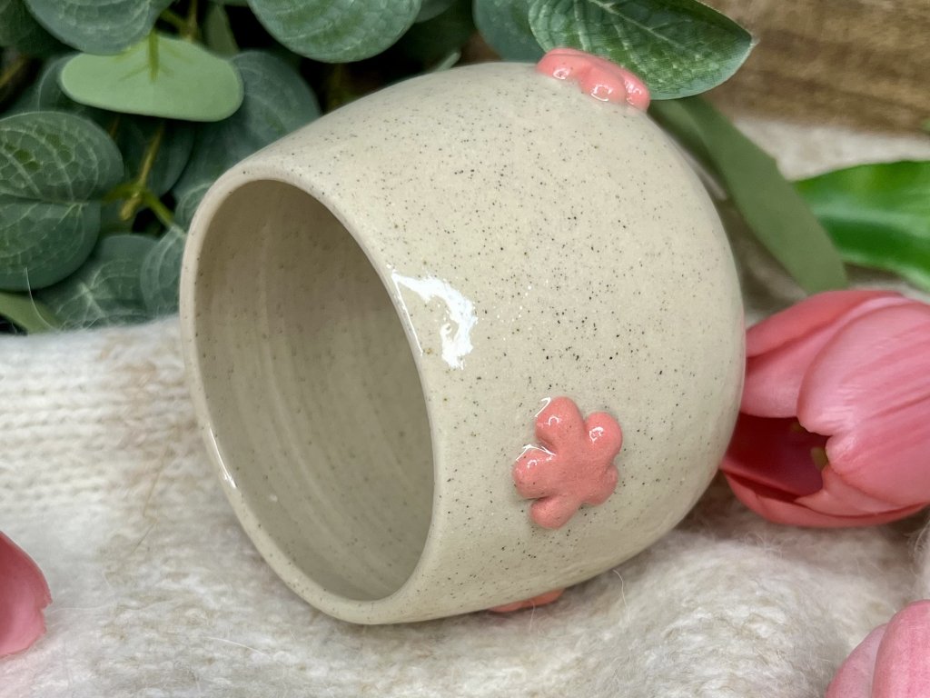 Kalíšek o objemu cca 180 ml, ručně točený ze světlé pigmentové hlíny, glazovaný transparentní glazurou.