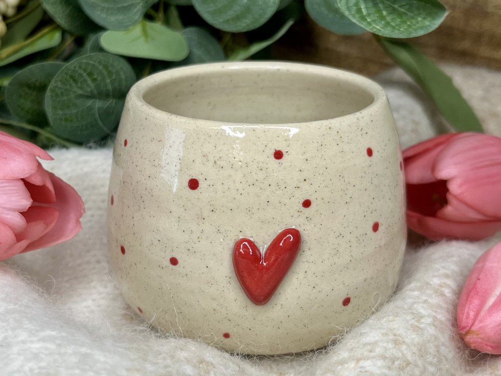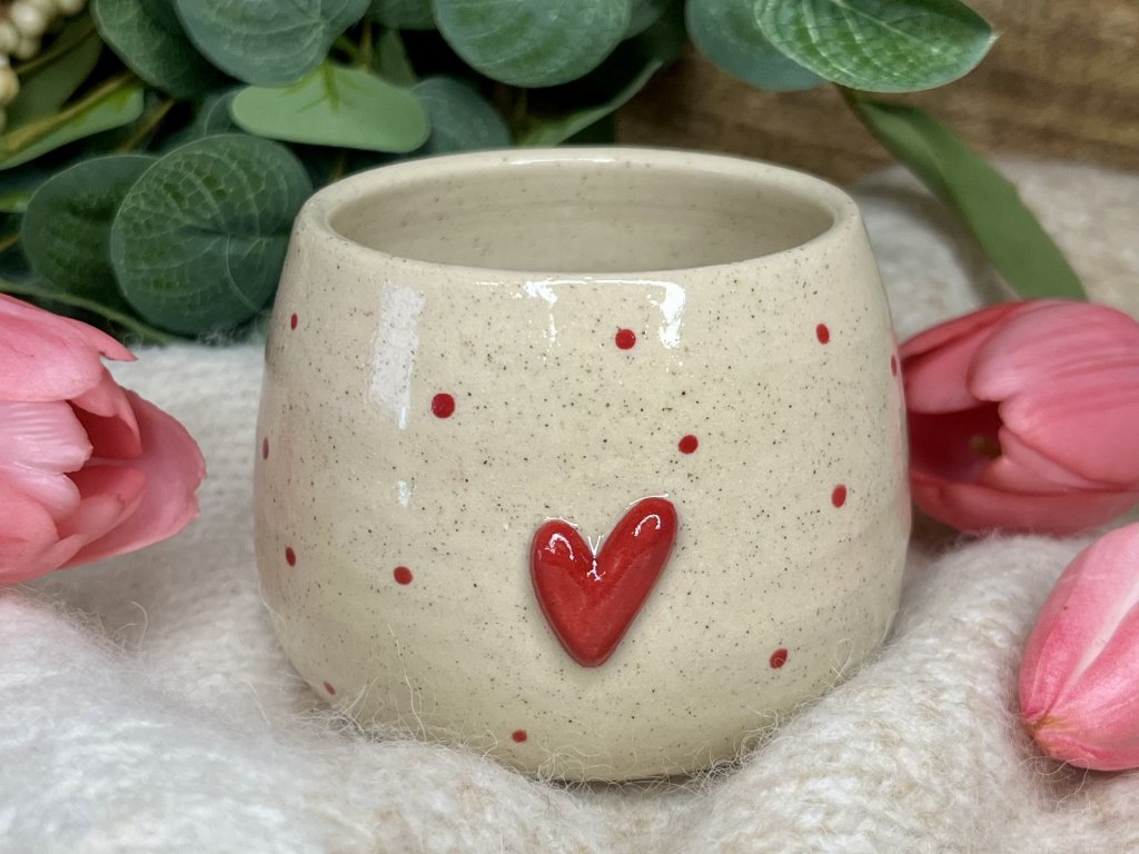 Kalíšek o objemu cca 240 ml, ručně točený ze světlé pigmentové hlíny, glazovaný transparentní glazurou.