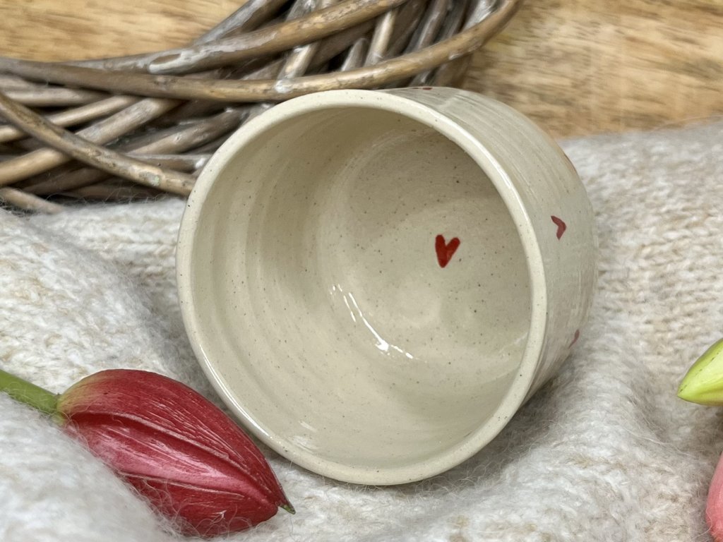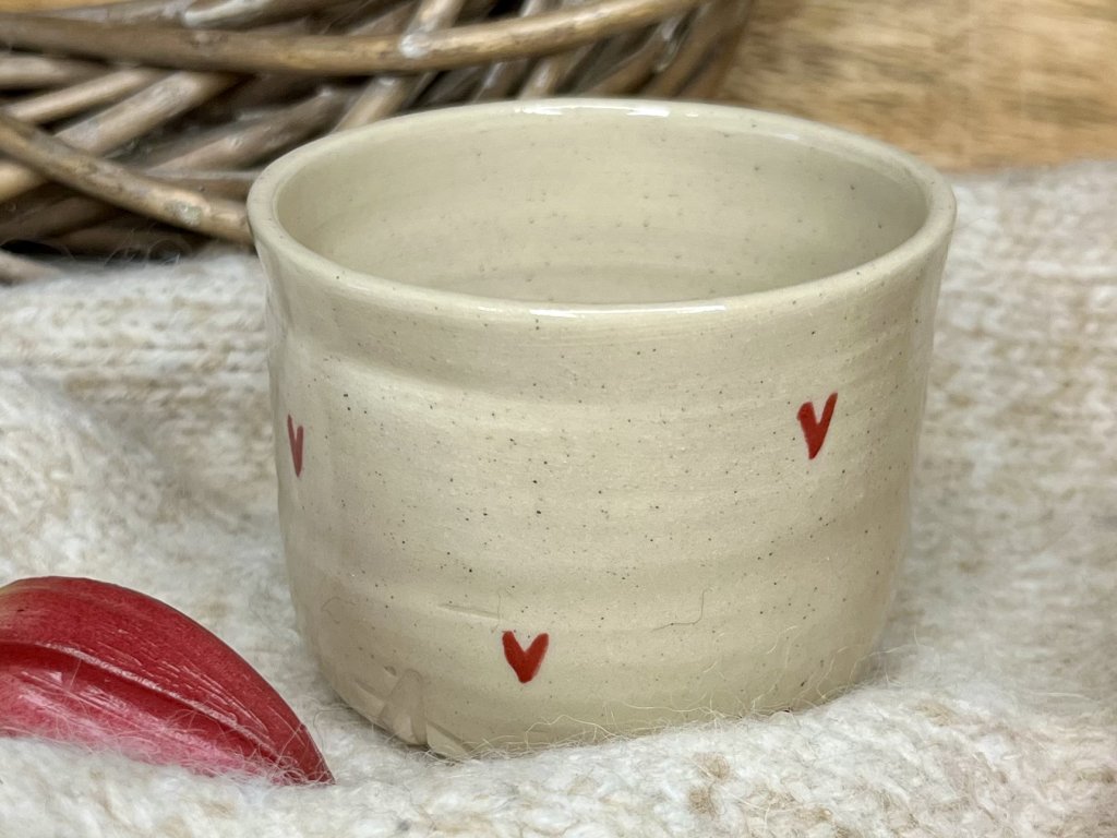 Kalíšek s ručně malovanými srdíčky o objemu cca 150 ml, ručně točený ze světlé pigmentové hlíny, glazovaný transparentní glazurou.
